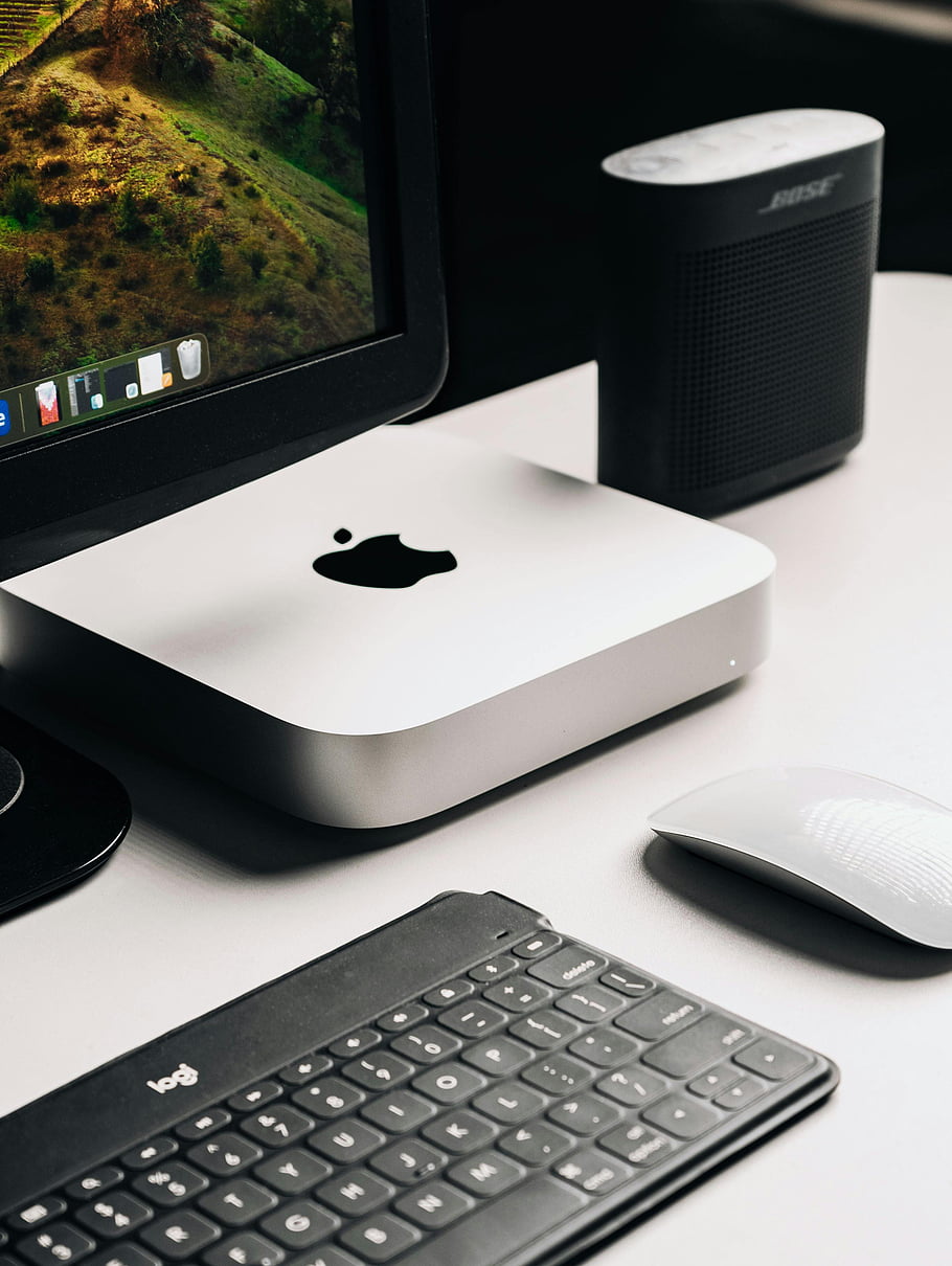 مساحة العمل الحديثة، إعداد الحاسوب، مراقب، لوحة المفاتيح، مكبر الصوت، إنتاجية، تصميم أنيق، إكسسوارات المكتب، أبل ماك ميني، لوحة مفاتيح لوجيتك، المتحدث بوس -