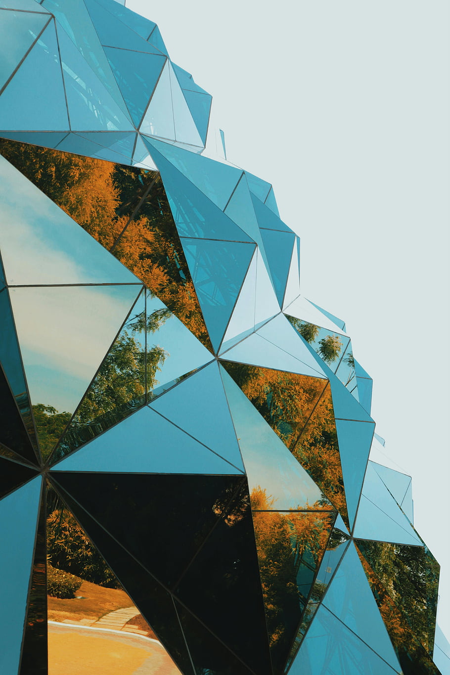 геометрична отразяваща фасада, футуристична сграда, геометрични модели, отразяваща повърхност, модерна архитектура, дърво отражение, размисъл на небето, архитектурен дизайн, стъклена фасада, градски пейзаж, съвременна сграда