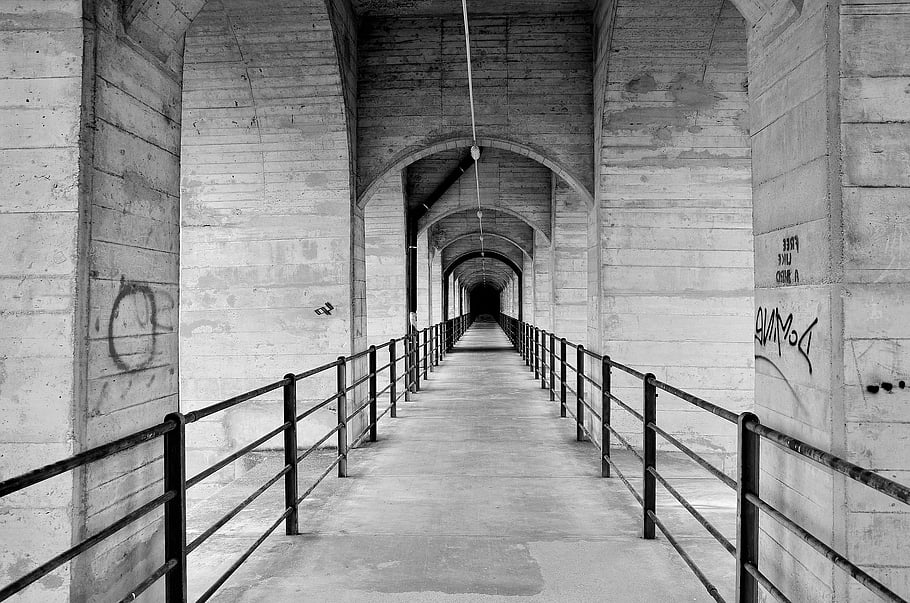 мост, коридор, сграда, монохромен, колони, парапет, архитектура