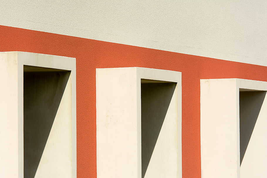 червена и бяла стена, минималистична архитектура, геометрични модели, правоъгълни отвори, приглушени цветове, архитектурна структура, снимка отблизо, модерен дизайн, абстрактно изкуство, архитектурен детайл, червена ивица