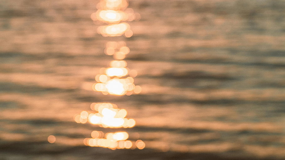 západ slunce, oceán, Golden Bokeh, abstraktní reflexe, klidná nálada, Umělecká nálada, vodní hladiny, bokeh efekt, západ slunce reflexe, západ slunce oceánu, zlaté světlo