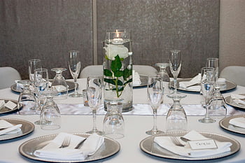 nádobí, nastavení tabulky, skleněné zboží, příbory, Elegantní atmosféra, Sofistikovaný stůl, sklenice na víno, jídelní stůl, ubrus, formální stolování, uspořádání stolu