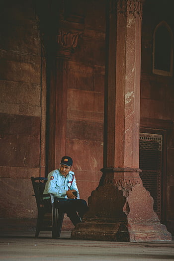 ochranka, historické budovy, velký sloup, sedící stráž, červený sloupec, strážní povinnosti, historické architektury, Vnitřní bezpečnost, uniformovaná stráž, Reflexní okamžik, architektonický detail