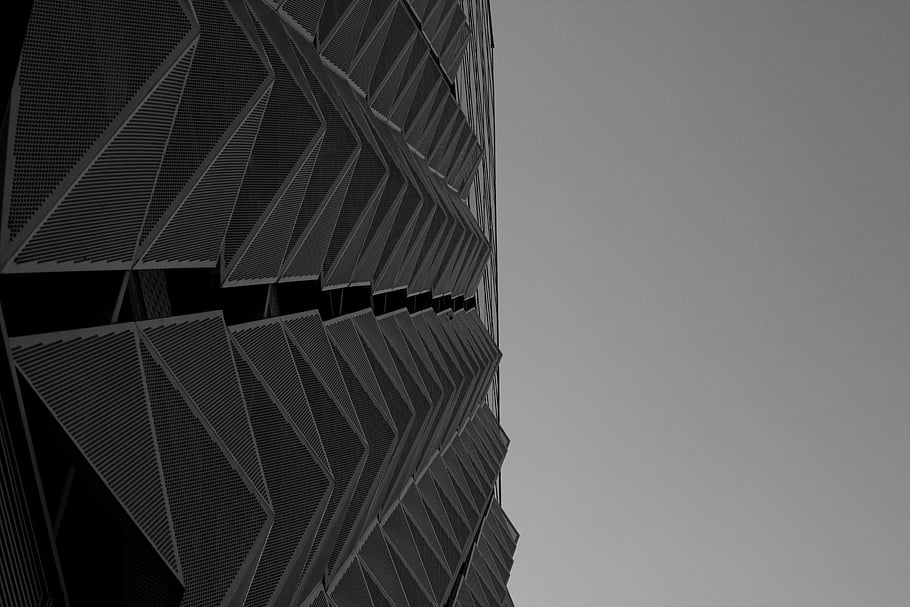 moderní architektura, Geometrická fasáda, skleněné stěny, městské budovy, Černý a bílý, Pozoruhodný design, současná struktura, architektonické detaily, vnější design, geometrický vzor, moderní fasáda
