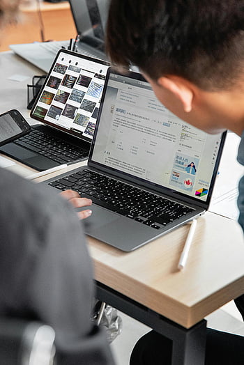 moderní kancelář, pracovního prostoru, notebooky, tablety, kolaborativní technologie, osoba pracující, nastavení stolu, využití technologie, Kancelářské prostředí, Nástroje produktivity, digitálních zařízení