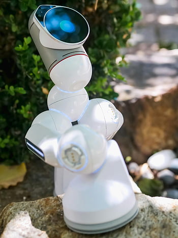 bílá robot hračka, hnědá skála, elegantní robotické zařízení, pokročilá technologie umělé inteligence, venkovní nastavení, robotické technologie, hračka robot, umělá inteligence, venkovní robot, Moderní robotika, robot na skále