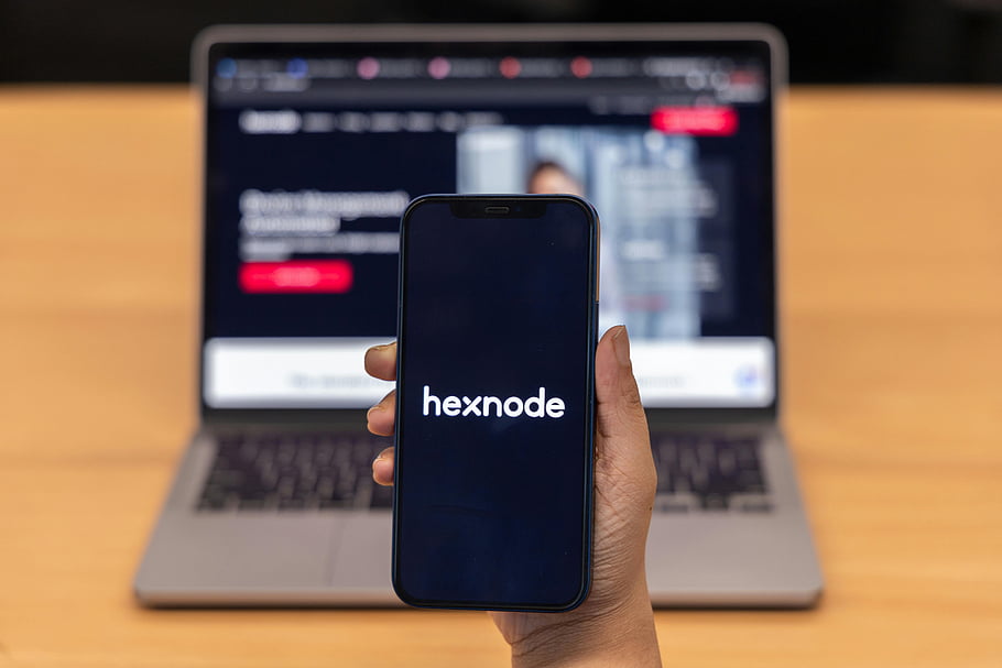chytrý telefon, Aplikace Hexnode, detailní záběr, ruka hospodářství, rozmazaný notebook, mobilní zařízení, technologie, zobrazení aplikace, digitální displej, Nastavení kanceláře, pracovní prostředí