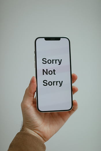 ruční držení smartphonu, Promiň, ne promiň, detailní fotografie, displej smartphonu, bílé pozadí, krátká fráze, textová zpráva, mobilní telefon, digitální zpráva, gesto rukou, technologické zařízení