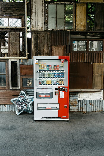 prodejní automat, nápoje, eklektická zeď, vlnitý kov, staré dřevěné panely, městském prostředí, Venkovní prodejní prodej, Výběr nápoje, retro prodejní automat, pouliční scény, Průmyslové pozadí