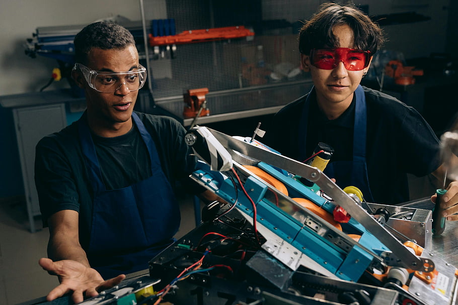 Elektrické inženýři, Robotické vybavení, Nastavení dílny, mladí inženýři, ochranné brýle, technické práce, inženýrský projekt, praktická práce, Mechanické komponenty, Kolaborativní práce, Technologický vývoj -
