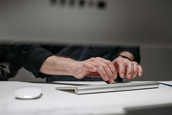 osoba používající myš, psaní na klávesnici, Moderní nastavení počítače, Kancelářské prostředí, Zaměřený detail, Elegantní klávesnice, počítačová myš, ruce psaní, moderní kancelář, počítačový stůl, pracovního prostoru