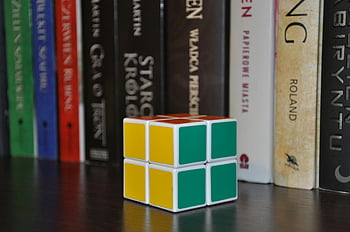 Krychle 2x2x2, Rubikova kostka, puzzle kostka, malá kostka, Barevná kostka, regál, knih, lavice, krytý, detail, hračka