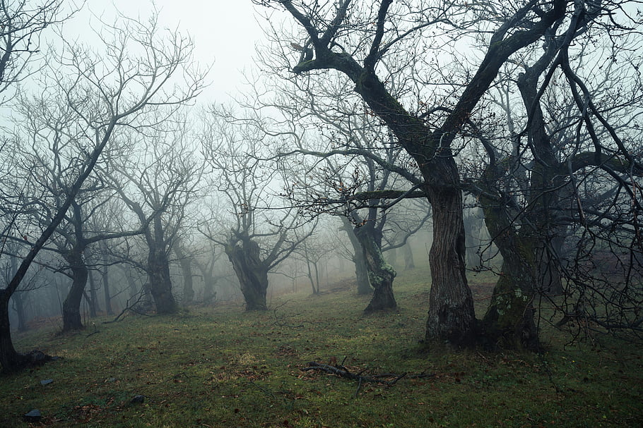 mlhavé krajiny, Holé stromy, Tajemná mlha, strašidelný podzim, lesní scény, mlhavé lesy, podzimní stromy, mlhavý les, holý strom les, děsivá atmosféra