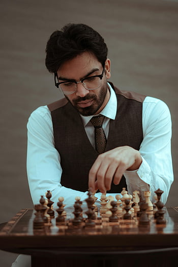 Promyšlený muž, Šachová soutěž, elegantně oblečený, Šachová strategie, Vnitřní nastavení, intelekt, koncentrace, Šachový hráč, šachová hra, soustředěný muž, brýle