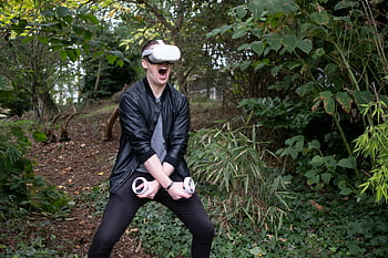virtuální realita, vr sluchátka, člověk hraje, nastavení lesa, VR ovladače, užívá si virtuální realitu, Outdoor Vr, pohlcující zkušenost, Hra virtuální reality, Muž ve Vr, lesní VR