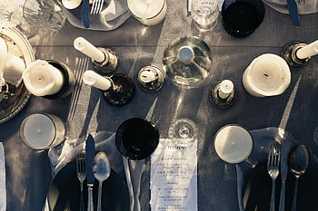 minimalistický stůl, letecký snímek, Minimalistické stolování, svíčky, nádobí, minimalistický dekor, jídelní stůl, nastavení tabulky, minimalistický styl, režijní pohled, elegantní stolování