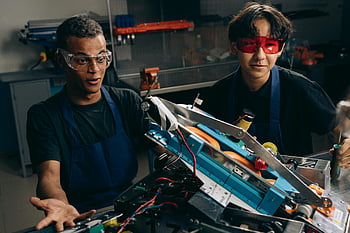 Elektrické inženýři, Robotické vybavení, Nastavení dílny, mladí inženýři, ochranné brýle, technické práce, inženýrský projekt, praktická práce, Mechanické komponenty, Kolaborativní práce, Technologický vývoj
