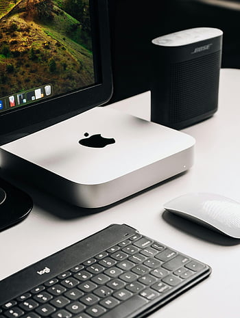 Moderní pracovní prostor, nastavení počítače, monitor, klávesnice, mluvčí, produktivita, elegantní design, stolní příslušenství, jablko mac mini, Klávesnice Logitech, Bose reproduktor