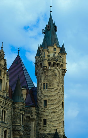 středověký hrad, starověká gotika, hradní věž, modrá obloha, mraky, Ohromující architektura, kamenná struktura, historické budovy, středověké architektury, gotický design, věž věže