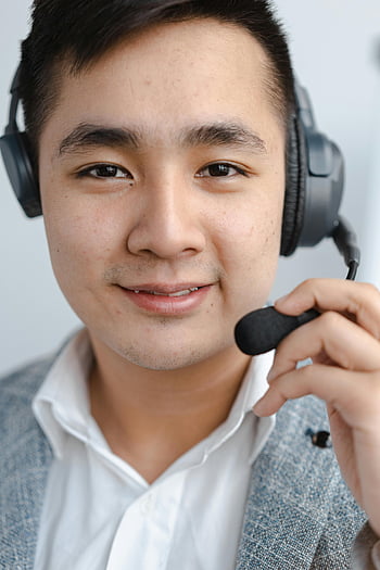 asijský muž, agent call centra, Šedá bunda, Mikrofon náhlavní soupravy, Nastavení kanceláře, Profesionální oděv, služby zákazníkům, sdělení, pracovní prostředí, obchodní profesionál, Vnitřní kancelář