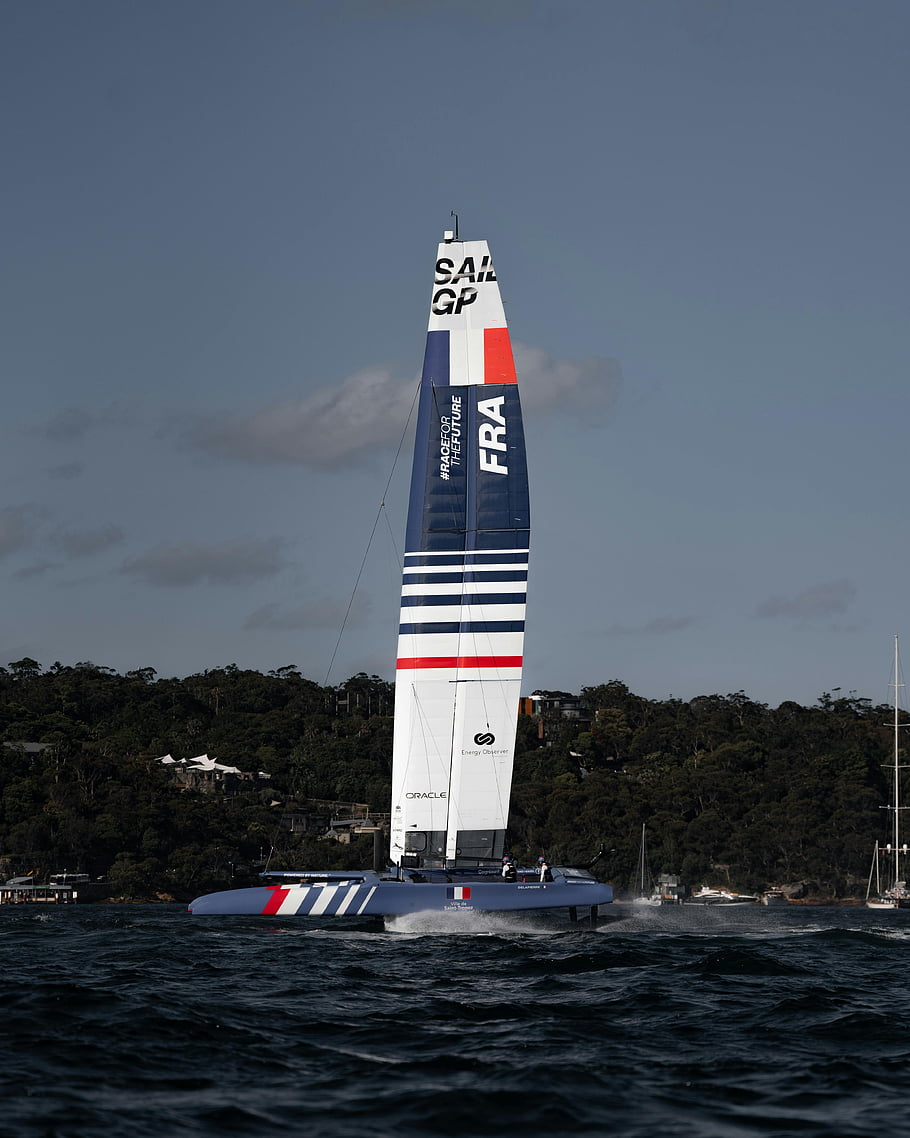 F50 Fóliový katamarán, SailGP, boční pohled, křídlo, dynamický obrázek, prořezávání vodou, blízko pobřeží, plachtění, věštec, závod o budoucnost, fra