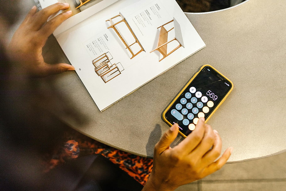 kalkulačka smartphonu, otevřený časopis, Nastavení kavárny, individuální použití, chytrý telefon, Aplikace kalkulačky, otevřená kniha, café stůl, čtení, Mobilní kalkulačka, Čtení časopisu