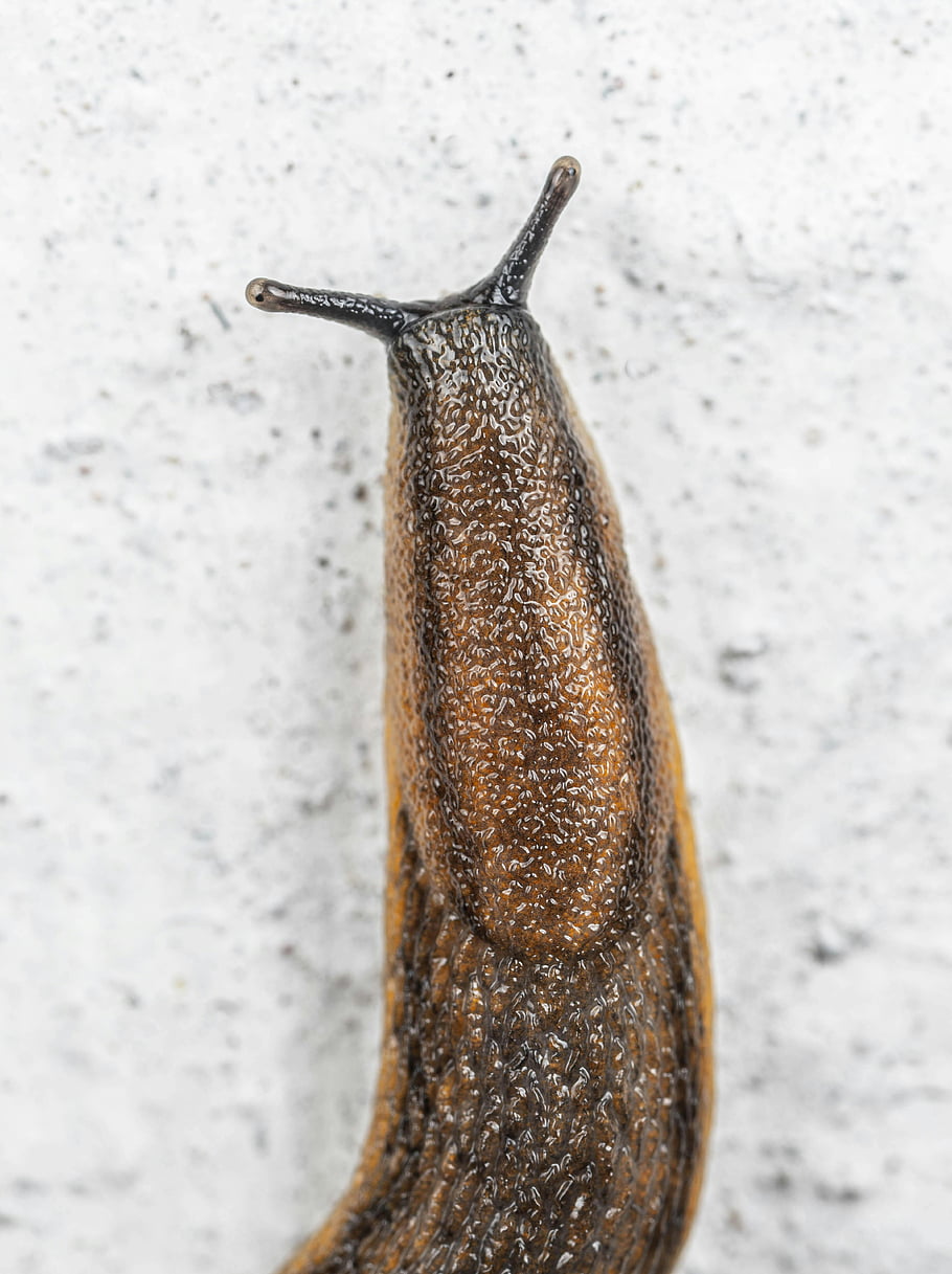slimák, detail, makro snímek, Hnědý slimák, světlý texturovaný povrch, textura slimáka, Podrobný výstřel, pohybující se slimák, fotografování slimáků, obrázek slimáka, slimák detailní záběr