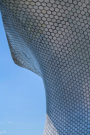 muzeum soumaya, Mexico City, zakřivená kovová fasáda, geometrické vzory, modrá obloha, architektonický design, moderní architektura, hexagonální vzory, kultovní budova, kulturní památka, městské krajiny
