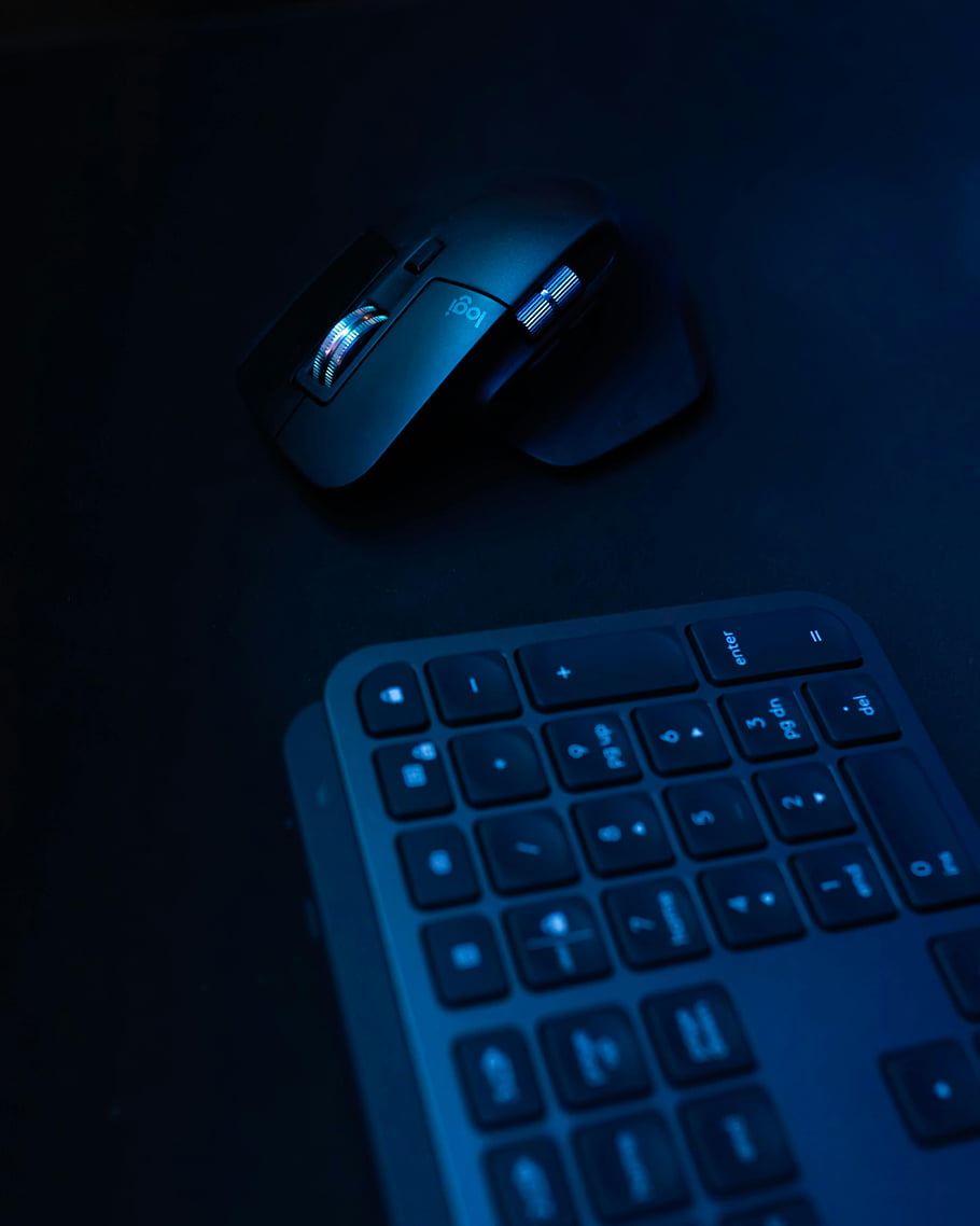 klávesnice, myš, modré světlo, bezdrátové klávesnice, elegantní design, nastavení stolu, počítačové periferie, myš logitech, detailní záběr, moderní technologie, osvětlená klávesnice