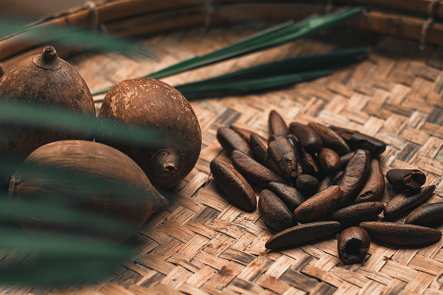 kokosové ořechy, piniové oříšky, tkaná podložka, rustikální displej, organický pocit, přírodní piniové oříšky, tradiční rohož, rustikální prostředí, organický displej, přírodní kokosové ořechy, piniové oříšky a kokosové ořechy