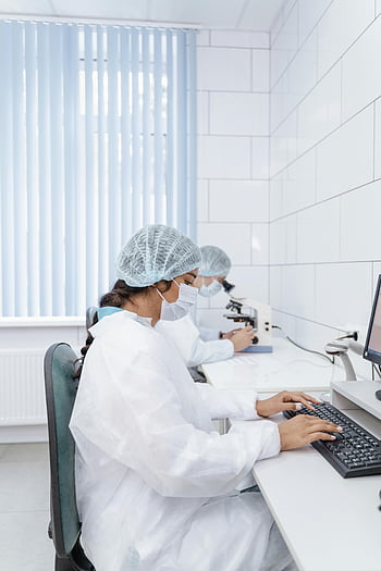 vědci, ochranné zařízení, mikroskop, moderní laboratoř, Bílý ochranný oblek, bílá maska, Blue Bouffant Cap, Laboratorní nastavení, vědecký výzkum, lékaři, laboratorní vybavení
