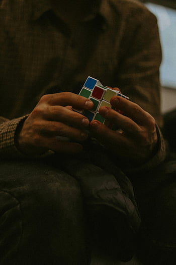 Rubikova kostka, řešení hádanky, Detailní ruce, koncentrace, dovednost, vnitřní činnost, Hnědé dlouhé rukávy, osoba řešící, Luštitel Rubikovy kostky, Řešení hádanek, vnitřní puzzle