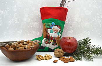vánoční punčocha, vánoční motiv, předvánoční čas, Vánoce, Mikuláše, Nicholas Day, jablka, ořechy, rozinky, ovoce, mandle