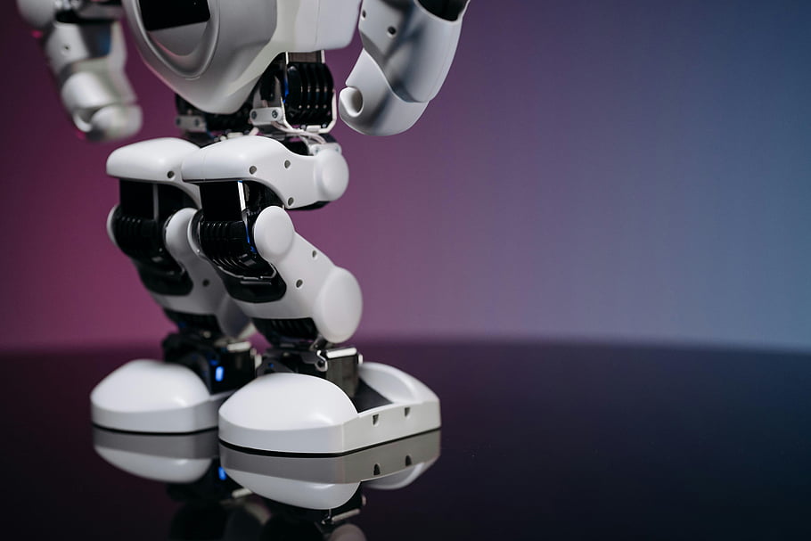 robotické nohy, bílý robot, lesklý povrch, futuristický design, High-tech robot, černý lesklý povrch, robotické koleno, odrazný povrch, Moderní robotika, pokročilá technologie, Robotické inženýrství