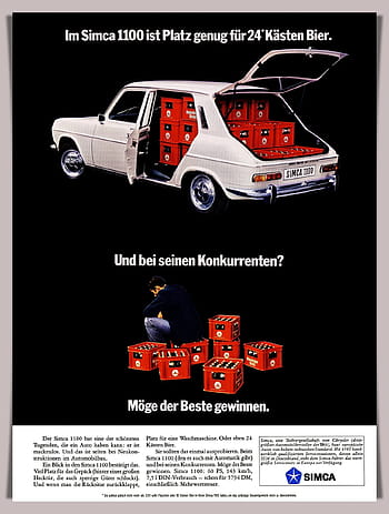 SIMCA 1100, auto, reklama, přepravky na pivo, prostor zavazadlového prostoru, Německá reklama, Historické auto, otevřený kufr, muž sedící, Červené bedny, černé pozadí