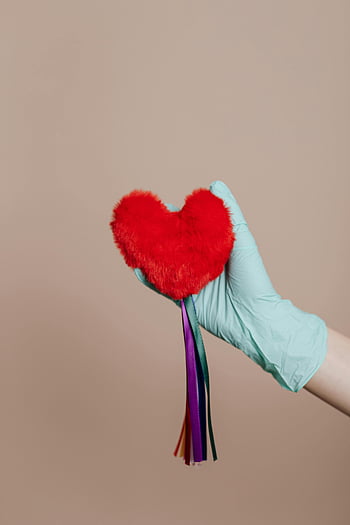 ruka v latexové rukavici, červený plyšový kousek ve tvaru srdce, Barevné struny, symbol lásky, Bezpečnostní symbol, plyšové srdce, barevné srdce, láska a bezpečí, srdce s strunami, srdce s barevnými provázky