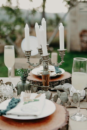 elegant rustik borddækning, blomster, stearinlys, intime sammenkomster, rustikke bord, bordindstilling, blomster arrangement, udendørs indstilling, træbord, hvid duge