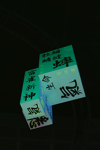 japanische Zeichen, leuchtender Text, Zusammenfassung Ansicht, dunkler Hintergrund, Textfelder, Japanischer Text, Leuchtreklamen, Beleuchteter Text, Nachtszene, moderne Kunst, Typografie
