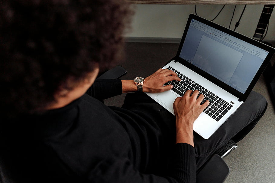 Graustufenfoto, Person, die Laptop verwendet, Schwarzweiss-Bild, Tippen auf Laptop, konzentriertes Arbeitsumfeld, Geschäftsfrau arbeitet, professionelle Einstellung, Büroarbeit, Computergebrauch, Arbeitstisch, Geschäftskleidung