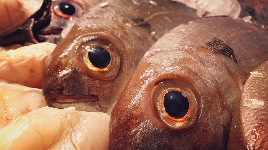 Fisch, Meeresfrüchte, Markt, frischer Fisch, Fischaugen, Fischkopf, Fisch-Display, Fischmarkt, Nahaufnahme Fisch, Fischstruktur, Fischsorte