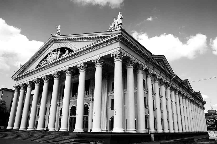 φωτογραφία σε κλίμακα του γκρι, σκυρόδεμα, μαύρο και άσπρο, νεοκλασικό κτίριο, κομψοί πυλώνες, μεγάλη αρχιτεκτονική, ιστορική δομή, μονόχρωμη εικόνα, αρχιτεκτονική φωτογραφία, κλασικό σχέδιο, αστικό τοπίο