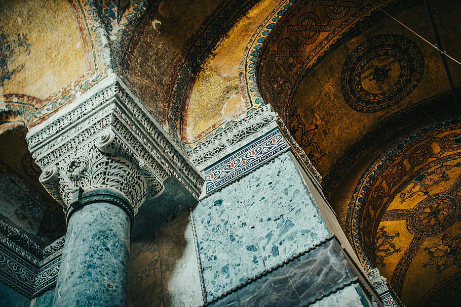 Βυζαντινή Αρχιτεκτονική, περίτεχνες στήλες, διακοσμημένες οροφές, διακοσμητικά στοιχεία, λεπτομερείς στήλες, κοντινή αρχιτεκτονική, βυζαντινού ρυθμού, αρχιτεκτονικές λεπτομέρειες, ιστορική αρχιτεκτονική, εσωτερική διακόσμηση, περίτεχνα ταβάνια