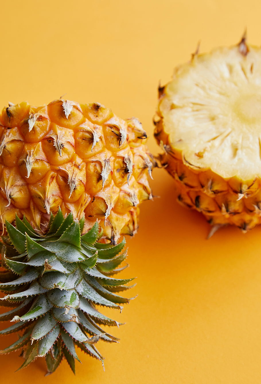 ανανάς, μισός ανανά, τροπικό φρούτο, κίτρινο φόντο, Φρέσκος ανανάς, ζωντανός εσωτερικός, κομμένο σε φέτες ανανά, φέτα ανανά, ανανάς μισό, φρούτα ανανά, ανανά φωτογραφία -