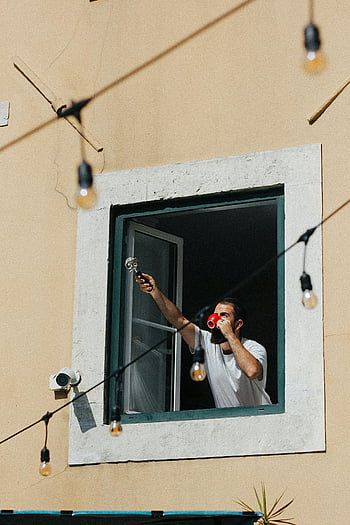 man drinking coffee, behind window, open window, lamp detail, string lights, casual moment, indoor scene, man at window, coffee time, relaxed atmosphere, urban setting