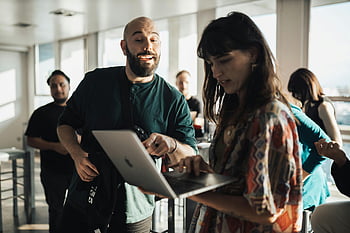 woman using laptop, work colleagues, modern office, business professionals, collaborating, laptops, discussions, office environment, professional setting, workplace interaction, team collaboration