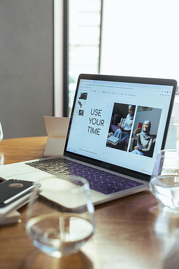 laptop computer, brown wooden table, productivity presentation, modern workspace, use your time, office desk, work environment, digital workspace, professional setting, productivity tools, modern office