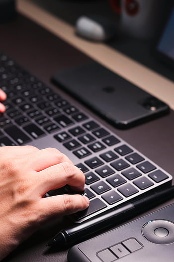 man typing, black keyboard, modern workspace, sleek keyboard, hand typing, workspace desk, laptop keyboard, smartphone, office desk, work environment, productivity tools