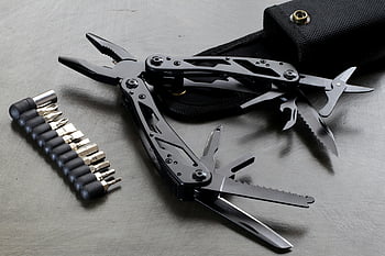 multi-tool, black multi-tool, everyday tools, attachments, close-up photography, table display, screwdriver bits, pliers, scissors, pocket tool, utility knife