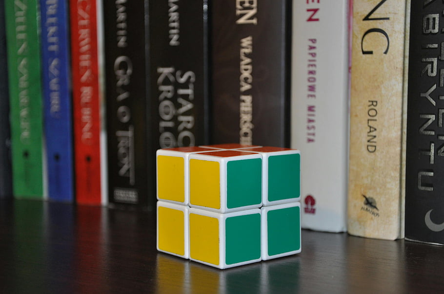 2x2x2 cube, Rubik's cube, puzzle cube, small cube, colorful cube, bookshelf, books, desk, indoor, close-up, toy