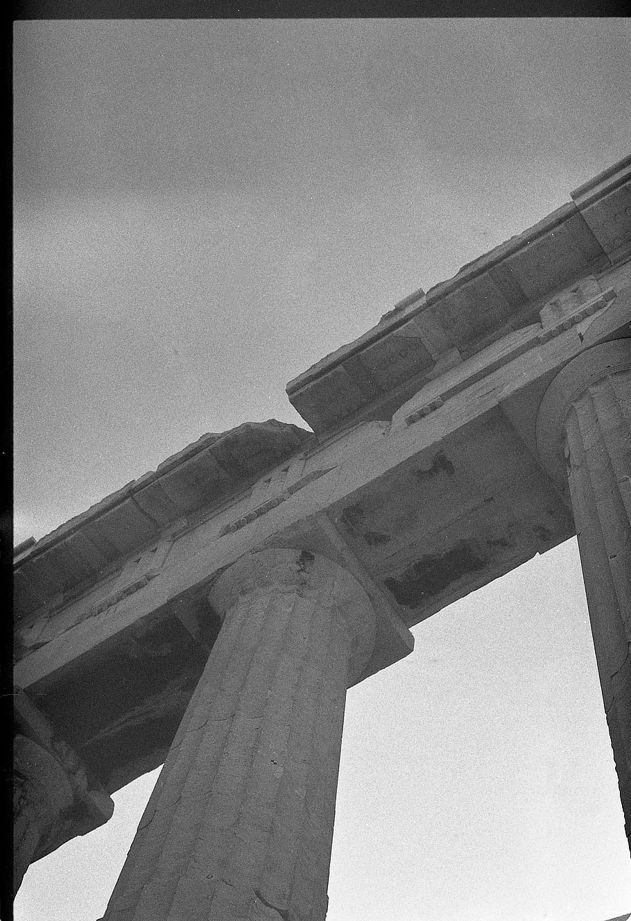 ancient ruins, Doric columns, low angle shot, monochrome, historical architecture, stone columns, classical architecture, ancient structures, architectural ruins, black and white, historical sites